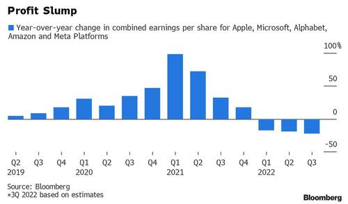 The five biggest firms by revenue among this cohort — Apple, Microsoft, Alphabet, Amazon.com and Meta Platforms — are mired in a profit slump, with earnings per share projected to fall 22% from the same quarter of 2021, data compiled by Bloomberg show.