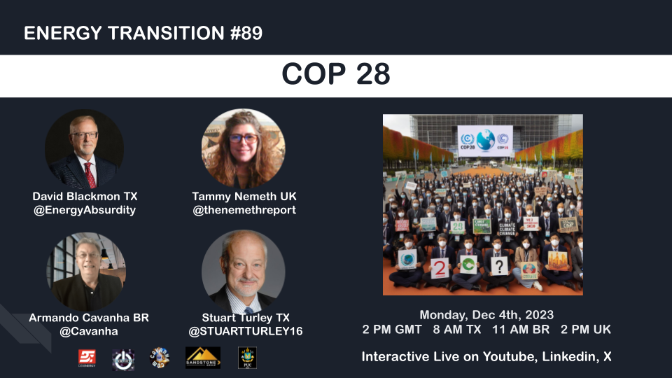 What a tremendous international discussion on the Energy Transition and the climate drama at COP28. You can’t buy this kind of entertainment with the Energy Transition team. Send in your questions, and see the gang every Monday morning. Follow Armondo and get notices of events.