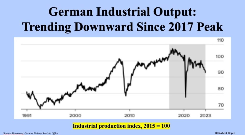 Deindustrialization: Manufacturing output has trended downward since 2017, with energy-intensive sectors like chemicals (-5%) and steel (-10%) hit hard. BASF and other firms have relocated production to the US and Asia due to costs 2-4 times higher than in America.