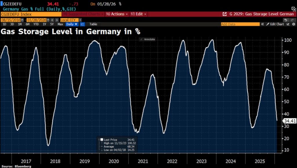 This chart shows Germany’s storage levels over recent years, highlighting the unusually low position in early 2026 compared to historical norms.