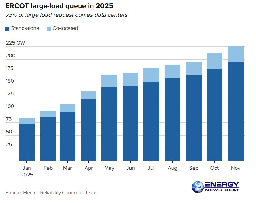 The numbers are staggering. As of August 2025, ERCOT had received requests for 572 GW of new connections from large users, with data centers comprising the lion’s share.