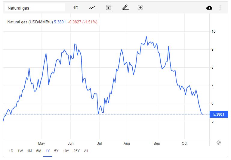 US natural gas futures dropped for the fifth straight session to $5.3/MMBtu, the lowest in seven months, after the latest EIA report showed another larger-than-usual storage build. US utilities added a more than expected 111 billion cubic feet (bcf) of natural gas to storage last week, well above a build of 91 bcf during the same week a year ago and a five-year (2017-2021) average increase of 73 bcf. Natural gas prices have been under pressure amid forecasts of lower weather-driven demand, record domestic production levels and reduced liquefied natural gas (LNG) exports, allowing utilities to inject more gas into storage. Average US gas demand, including exports, is expected to fall to 94.9 bcfd next week from 100.3 bcfd this week.