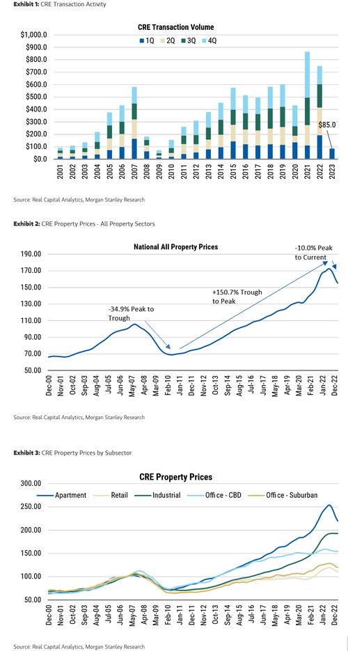 Meanwhile, a recent report from the Morgan Stanley team expects CRE prices to be down 27.4% from peak to trough in 18 to 24 months this cycle, not that far off from the -34.9% during the GFC in 34 months, which will range from a decline of 15% for apartments to a stunning plunge of 40% for office.
