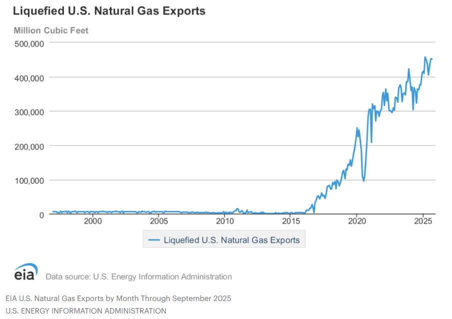 President Trump moved on Day 1 of his second presidency to end Biden’s permitting blockade and spent the rest of the year invoking a series of policy changes designed to spur the industry’s growth. Through September 2025, the result has been a 25% year-over-year uptick in exports volumes, cementing U.S. LNG’s position ahead of other big exporters like Australia and Qatar.