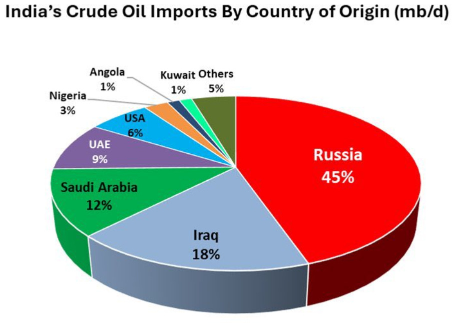 Russian Urals crude trades at steep discounts to Brent. India’s complex refineries are built to process heavy, sour grades exactly what Russia produces. When you’re refining for 1.4 billion people and trying to keep pump prices politically tolerable, a $10 per barrel discount is a strategic imperative.