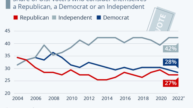 According to a series of Gallup surveys taken throughout 2022, on average, 42 percent of respondents said they would define themselves as politically independent this year, versus 27 percent as Republicans and 28 percent as Democrats.