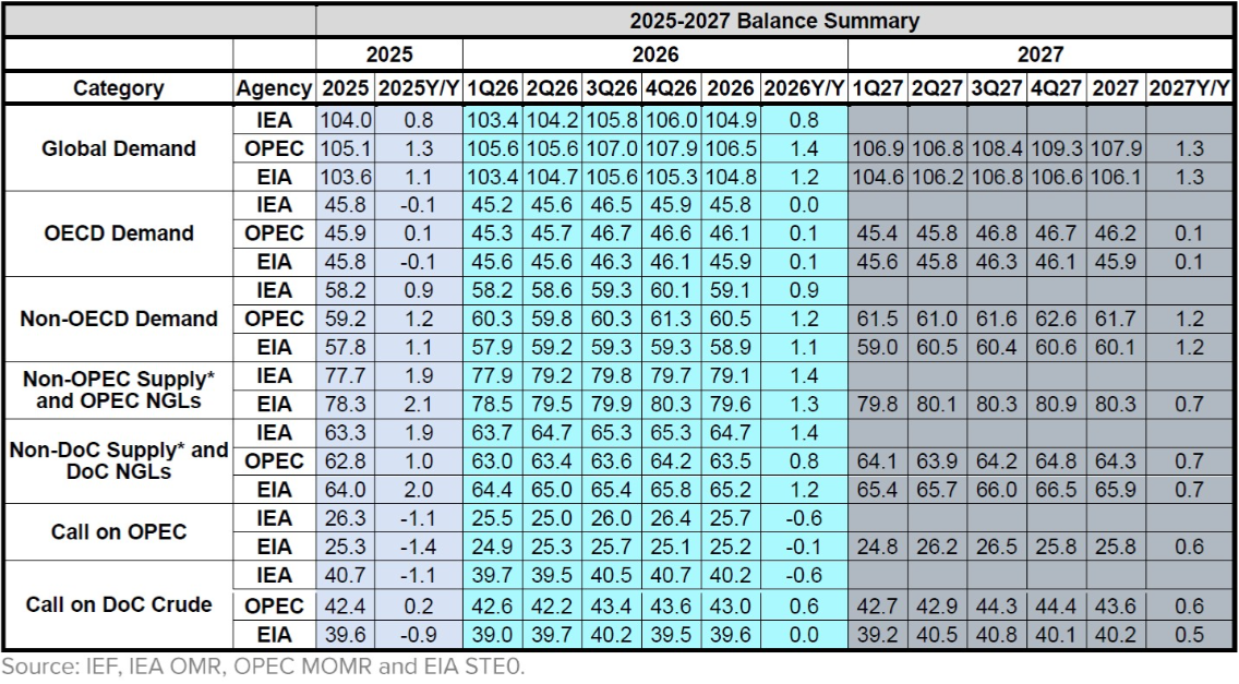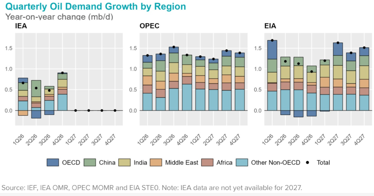 Quarterly oil demand growth (left) and 2025–2027 balance summary (right) from IEA, OPEC, and EIA comparisons highlight divergent but generally modest growth outlooks amid conflict uncertainty.