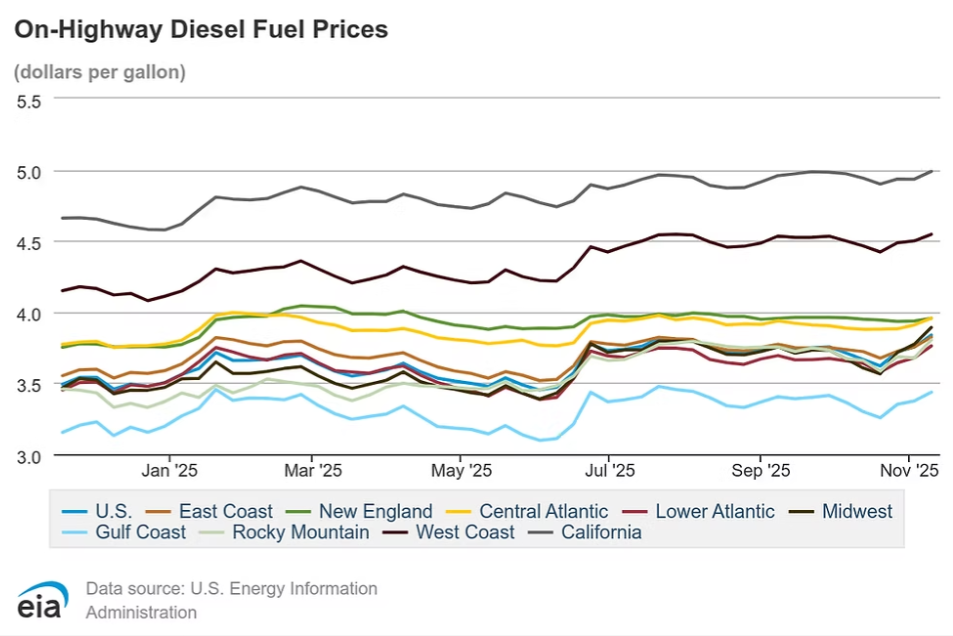 U.S. on-highway diesel and regional gasoline price trends (EIA data) show upward pressure persisting into 2026 before potential moderation.