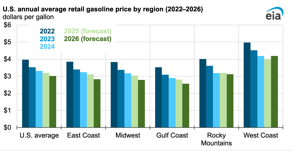 EIA Forecasts (U.S. retail): Gasoline: Average $3.70/gal in 2026 (peak ~$4.30/gal in April), up from $3.10/gal in 2025.