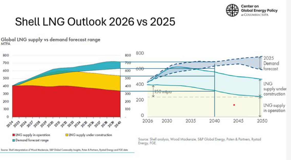 Shell LNG supply vs. demand outlook illustrates the impending surplus from new capacity coming online 2026–2030.