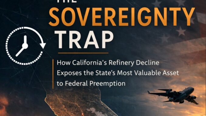 A new report from the Alliance for Innovation and Infrastructure, “The Sovereignty Trap: How California’s Refinery Decline Exposes the State’s Most Valuable Asset to Federal Preemption” (March 2026, by Mothusi Pahl), lays out the crisis in stark terms. California’s crude-processing capacity has collapsed from a 1980s peak of roughly 2.5 million barrels per day to about 1.27 million bpd across its remaining facilities. Northern California — a “fuel island” with no pipelines to the rest of the state — now faces a 36% gasoline shortfall. Statewide, the deficit sits at 13%. Zero days of strategic gasoline reserves. Aging plants prone to multi-month outages. And a regulatory thicket (CARB rules, New Source Review permitting, cap-and-invest expansions) that has made upgrades economically impossible.
