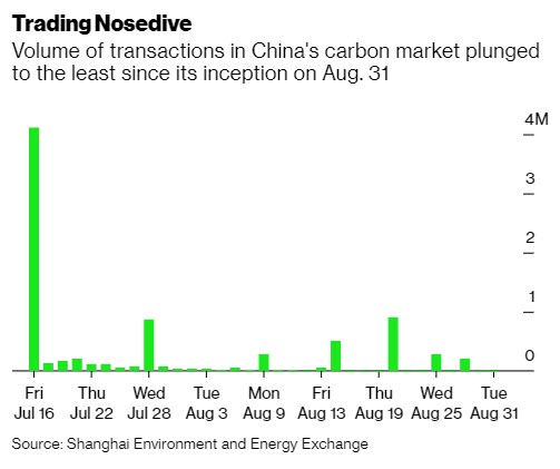 Trading volume in China’s carbon market has steadily dwindled since its July 16 launch, and fell to a record low Tuesday of just 23 tons, according to data from the Shanghai exchange. Participation has so far been limited to power generators by authorities who have yet to allow derivatives or wider financial markets to join.