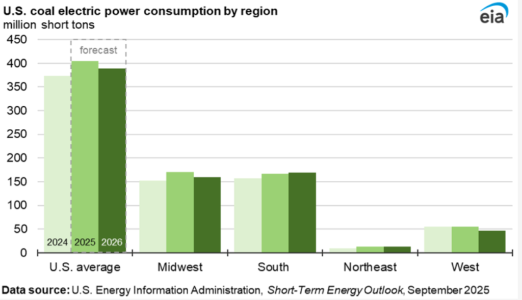 U.S. coal electric power consumption by region (EIA): National average up sharply in 2025, with regional variations.