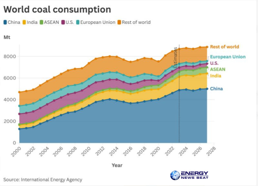 World coal consumption by region (IEA data): China and India dominate, with steady or growing demand in Asia-Pacific offsetting declines elsewhere. Crisis-driven switching is temporarily lifting U.S. and select European use.