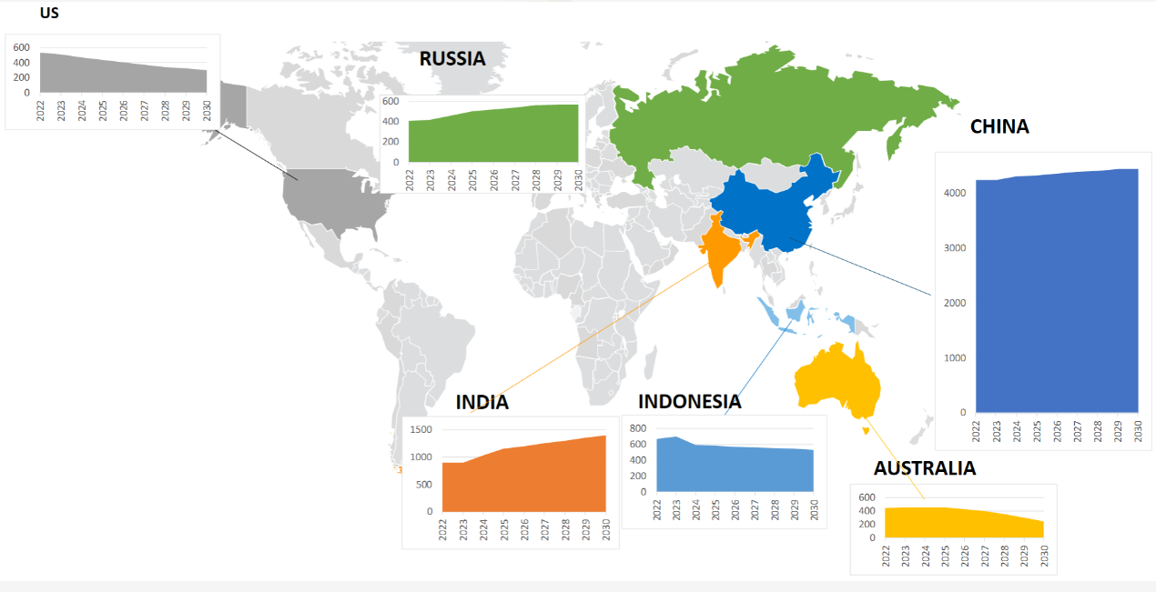 Coal production forecasts 2022–2030 by major countries (illustrative of sustained demand in China, India, Russia, Indonesia; U.S. and Australia more stable/declining).