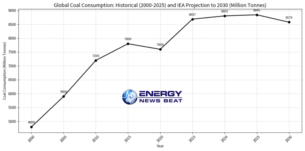 Global Coal Consumption: Historical (2000–2025) and IEA Projection to 2030 (Million Tonnes). Data compiled from