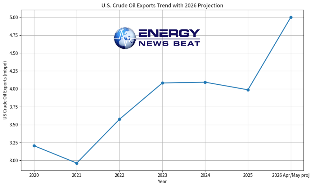 National U.S. crude oil exports followed a similar upward trajectory before a slight dip in 2025 (to ~3.99 mbpd annually), setting the stage for the current 2026 breakout.