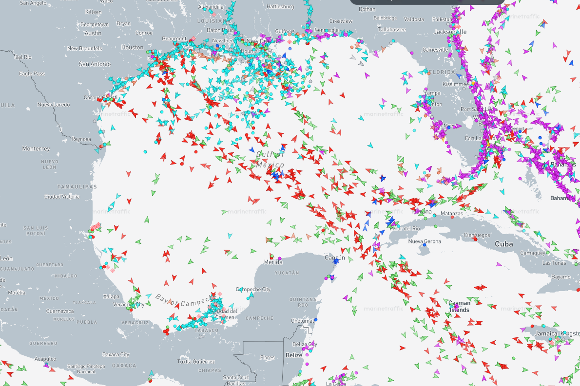 Current Tanker Traffic (April–May 2026): Tanker density in the Gulf of Mexico is visibly elevated on live-tracking platforms like MarineTraffic. The inbound fleet is overwhelmingly crude oil tankers—not product carriers. Availability of VLCCs (the largest crude carriers), Suezmax, and Aframax vessels has tightened dramatically along the U.S. Gulf Coast, with net vessel availability down sharply in recent weeks.