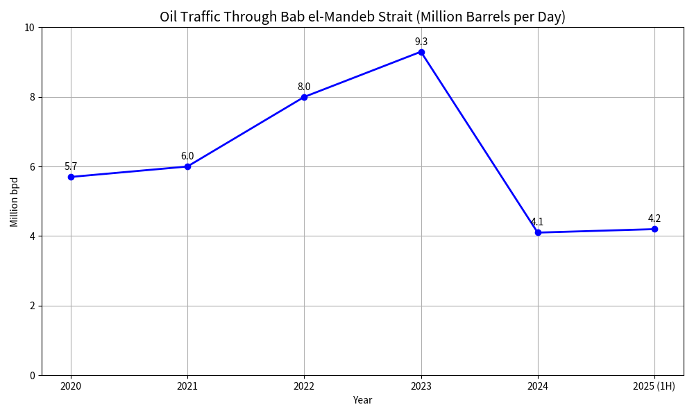 Last Five Years of Oil Traffic Through the Red Sea (Bab el-Mandeb Strait)Historical data from the U.S. Energy Information Administration (EIA) shows just how dramatically Red Sea oil flows have fluctuated — and how vulnerable they remain: