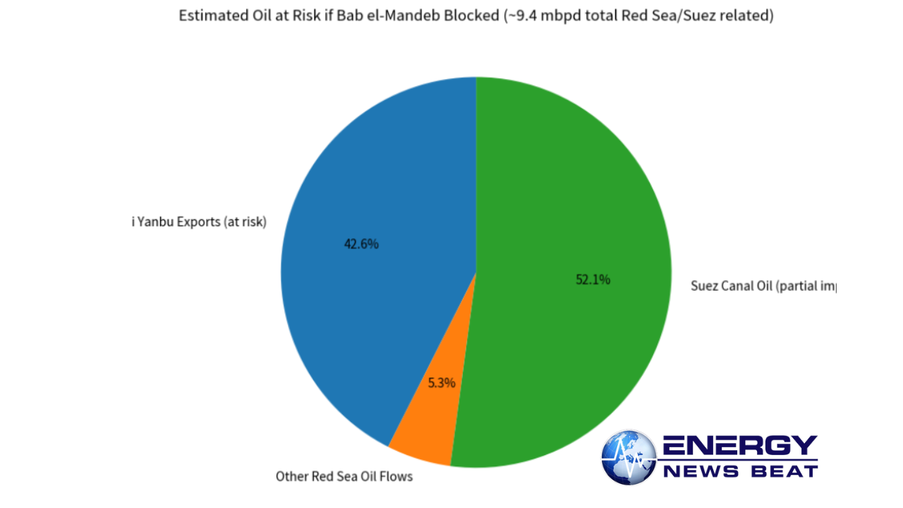 Total potential disruption: 4–9+ million bpd of oil and products moving through or dependent on the Red Sea route. Combined with the ongoing Hormuz crisis, this represents a historic supply shock — potentially removing 20–25% of global seaborne crude oil from efficient transit.