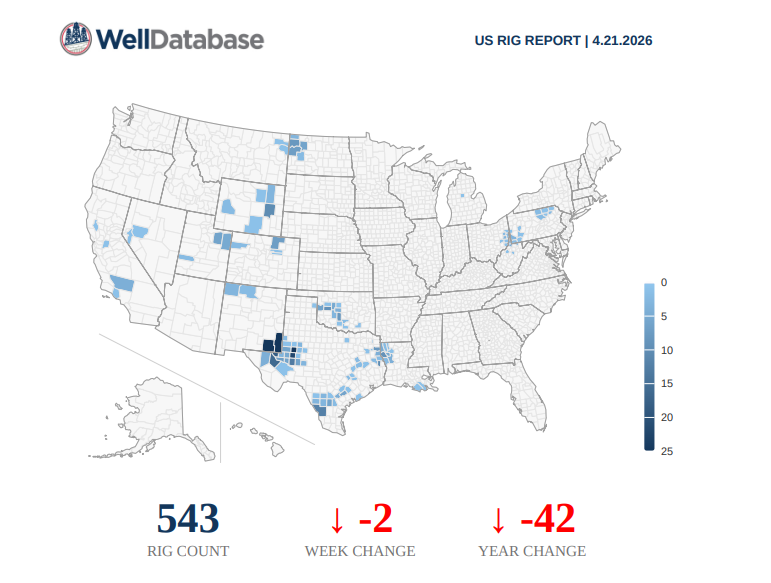 WellDatabase’s weekly Rig Report (including the user-referenced RigReport 4 21.pdf) aligns exactly with Baker Hughes national totals (543 rigs) while offering enhanced granularity such as county-level mapping, basin-specific oil/gas splits, permit cross-referencing, historical charts, and operator details. This provides deeper visibility into regional activity, confirming the national slowdown while highlighting pockets of stability in core areas like the Permian Basin.
