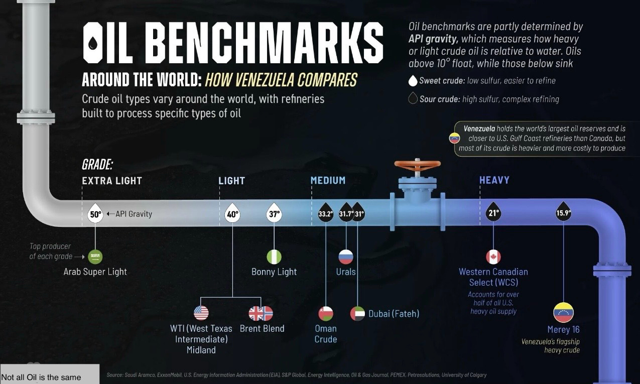 Venezuelan Merey heavy crude sits at roughly 16 degrees API gravity. Refining it profitably needs a coking unit, a hydrocracker, and serious desulfurization equipment. The economics work for refineries built specifically around Venezuelan feedstock. But it’s not a substitute for Iranian crude. It’s a completely different product that needs different industrial infrastructure. Venezuela’s main crude sits at the wrong end of the quality spectrum, global benchmarks like WTI and Brent are light, flexible barrels that work in most refineries with minimal processing.