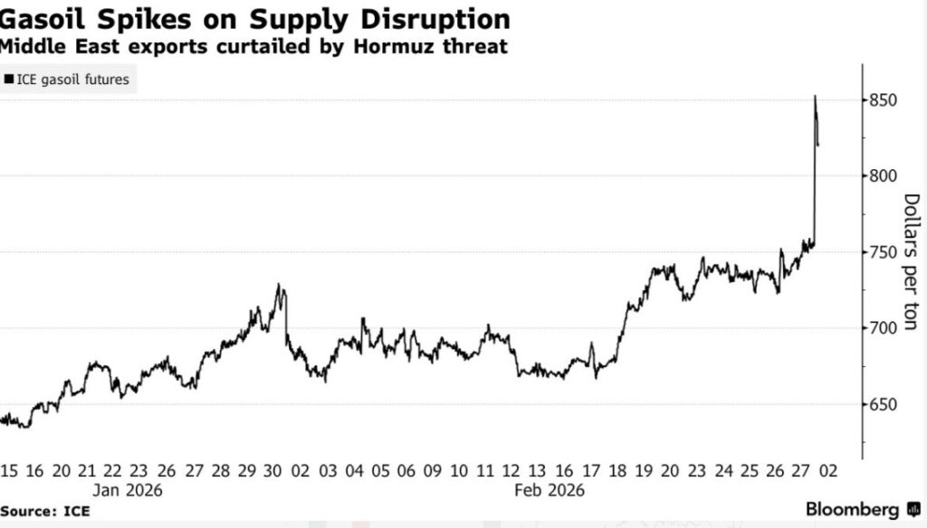 The disproportionate rise in diesel prices stems from regional supply concentration and the Strait’s role in 10.3% of global gasoil trade.