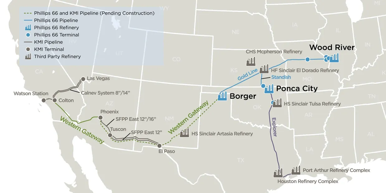 Reversals of existing infrastructure: Kinder Morgan’s SFPP pipeline segment from Colton, California, to Phoenix will be reversed to enable east-to-west flows into California. Phillips 66’s Gold Pipeline (currently flowing from Borger to St. Louis) will also be reversed to deliver refined products from Midwest refineries (including Illinois) and expanded Gulf Coast sources (Houston and Port Arthur/Beaumont areas) into Borger to feed the system.