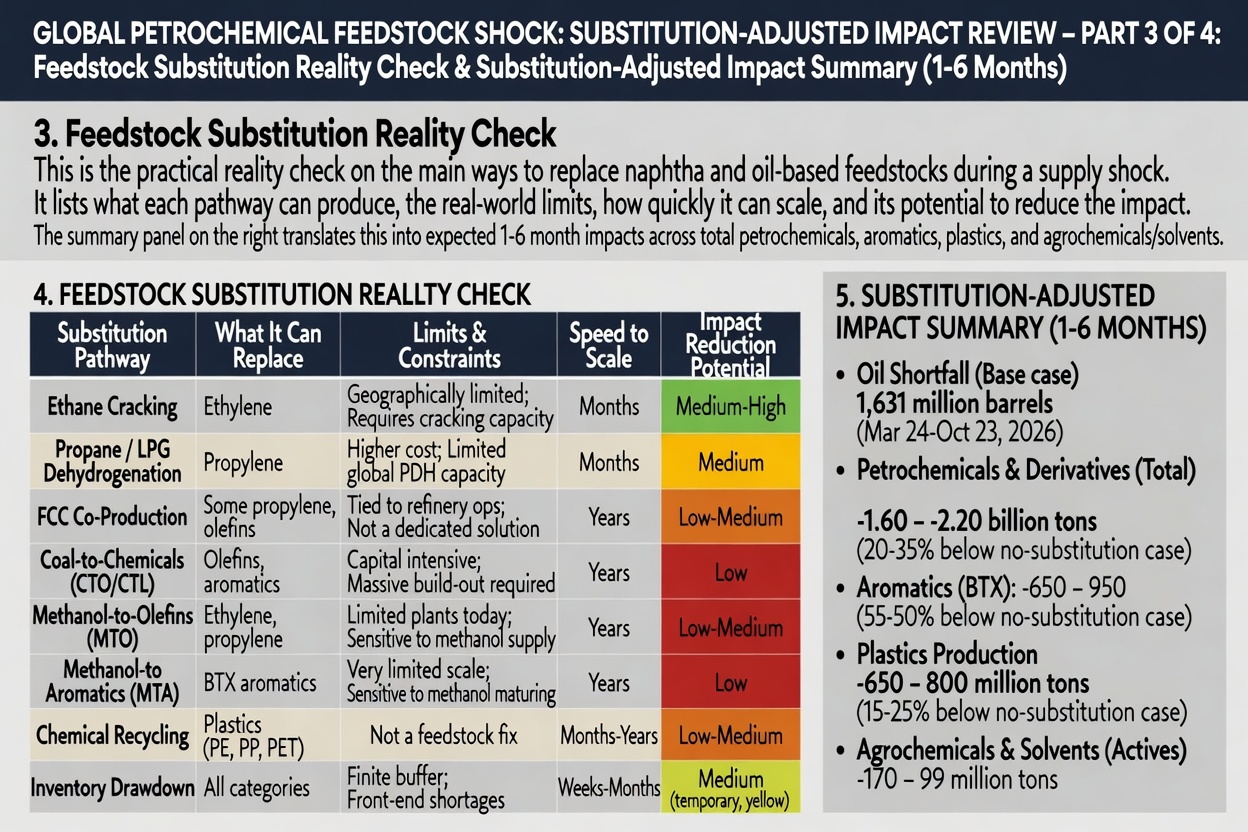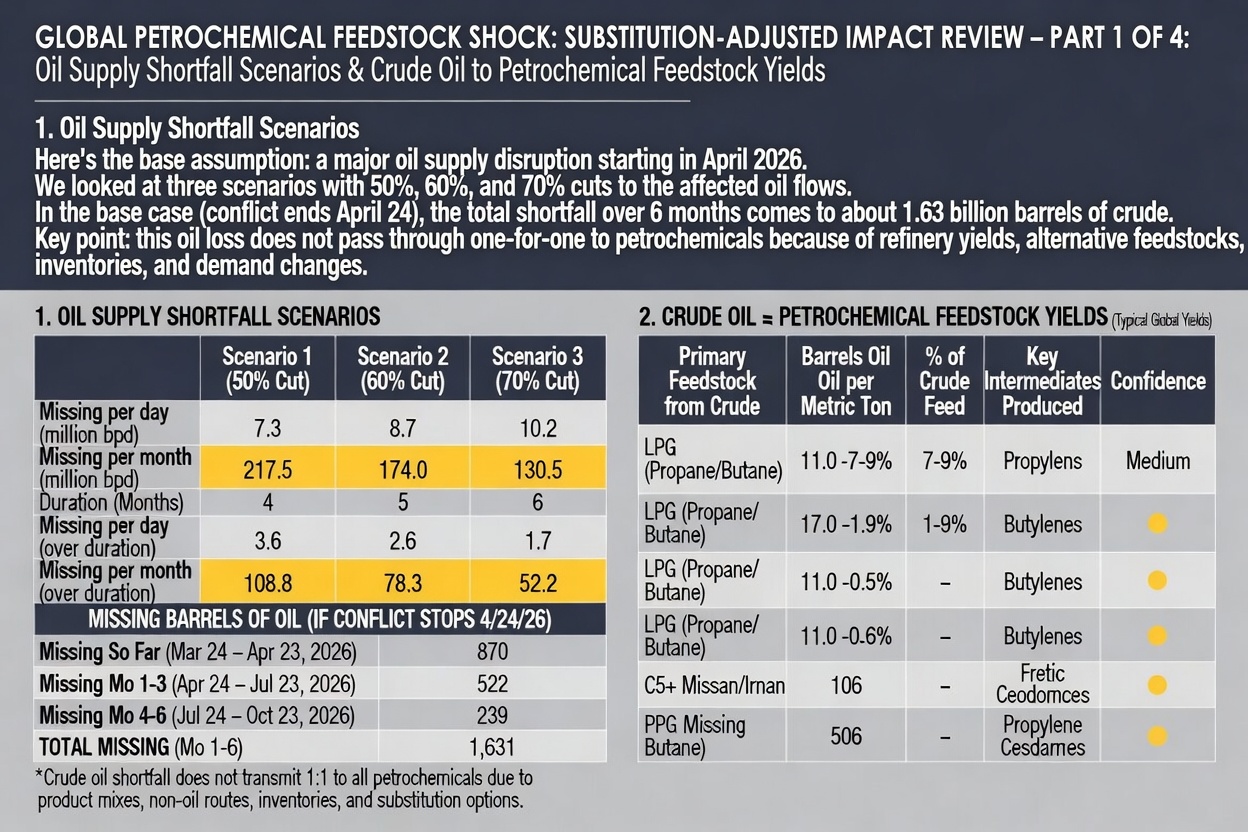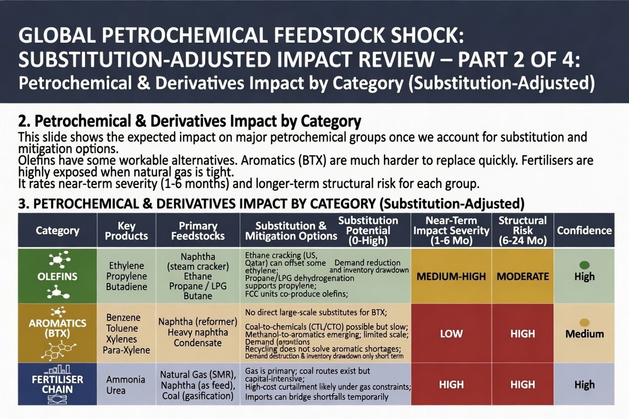 Even after notional adjustments for substitution (e.g., rerouting via alternative pipelines or sourcing from the U.S./Russia), the “After Substitution Impact Review” in Tindale’s framework shows severe net shortages. Plants are curtailing output across Asia, fertilizer inventories are plunging ahead of key planting windows, and petrochemical prices (polyethylene, polypropylene, MEG) have surged 30-40% in weeks.