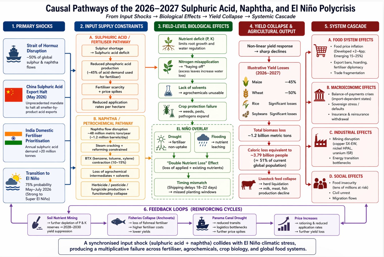 This is not merely an energy crisis—it is a petrochemical feedstocks shock rippling through global supply chains. As outlined in Craig Tindale’s powerful X thread (posted April 25, 2026), the disruption is triggering a “PolyCRISIS Framework 2026-27” that connects feedstock shortages to cascading effects in agriculture, manufacturing, finance, and beyond. Tindale’s slides detail the PetroChemical Feedstock Shock (Notional Adjust for Substitution), After Substitution Impact Review, Global Petrochemical Causal Pathway, Sulfur Acid to Fertilizer Shock, Naphtha/BTC Agrochemical Shock, and amplifiers like Super El Niño and misguided central-bank responses (including the Federal Reserve and RBA frameworks). He also highlights Tindale’s Trap—a $12.3 trillion blind spot accelerating de-industrialization in places like Australia.