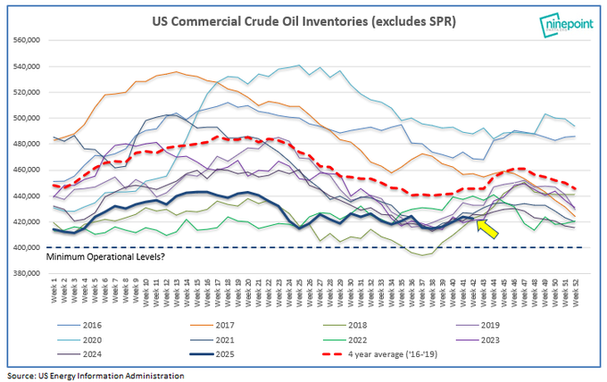 According to the U.S. Energy Information Administration (EIA)’s Weekly Petroleum Status Report for the week ending October 10, 2025, U.S. commercial crude oil inventories (excluding the Strategic Petroleum Reserve) increased to 423.8 million barrels, up 3.5 million barrels from the previous week.