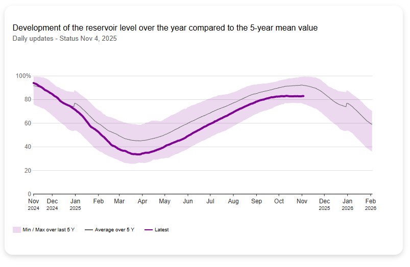 While still above the 2021 averages, the slower refill pace in 2025 is attributed to milder early weather and delayed imports. By October 1, 2025, storage reached 83%, providing some resilience but highlighting the need for accelerated injections to meet potential disruptions.