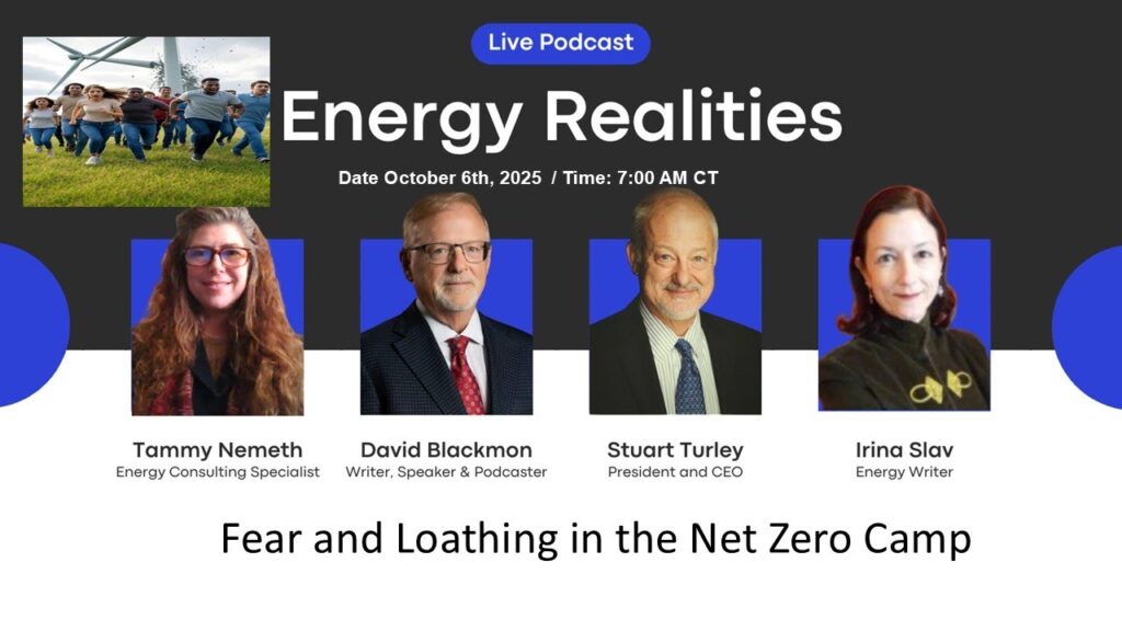You don’t want to miss this episode of the Energy Realities Podcast with the International Team from the UK, EU, and the US. We have Dr. Tammy Nemeth, Irina Slav, Stu Turley, and David Blackmon. We will be covering the latest updates in Net Zero, like the reports that the Net Zero Banking Alliance has voted to cease operations. Is this yet another fallout from the Trump UN Speech?