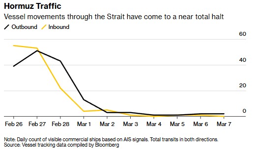 According to the latest Hormuz Tracker from Bloomberg, the strait has been at a near standstill for the sixth consecutive day.