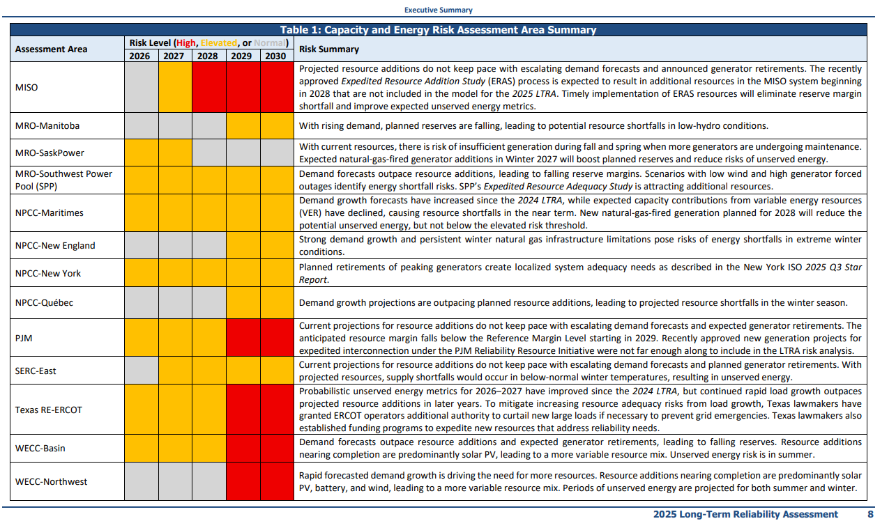 Sources: NERC 2025 Long-Term Reliability Assessment and associated press release.