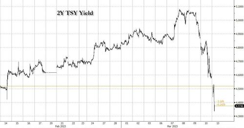 The news of Goldman’s capitulation send 2Y yields crashing as much as 25bps, and the 2Y was last seen as 4.3725, down from 5.06% on Wednesday…