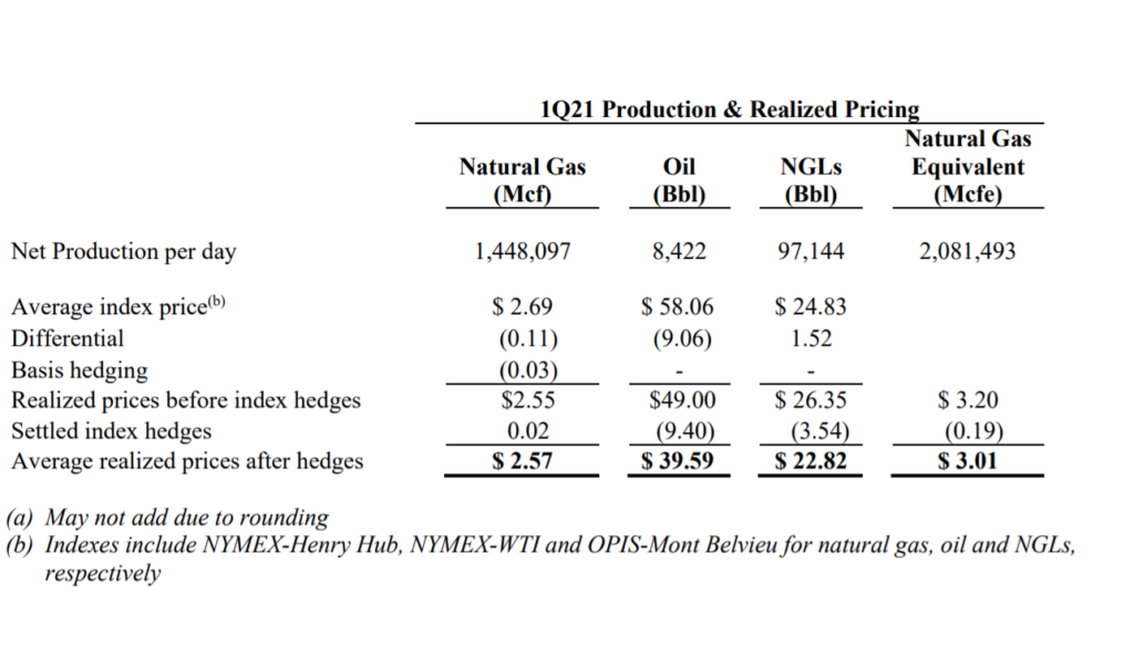 First quarter 2021 natural gas, NGLs and oil price realizations (including the impact of cash-settled hedges and derivative settlements which correspond to analysts’ estimates) averaged $3.01 per mcfe.