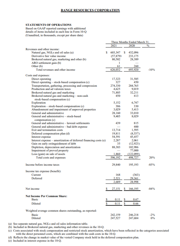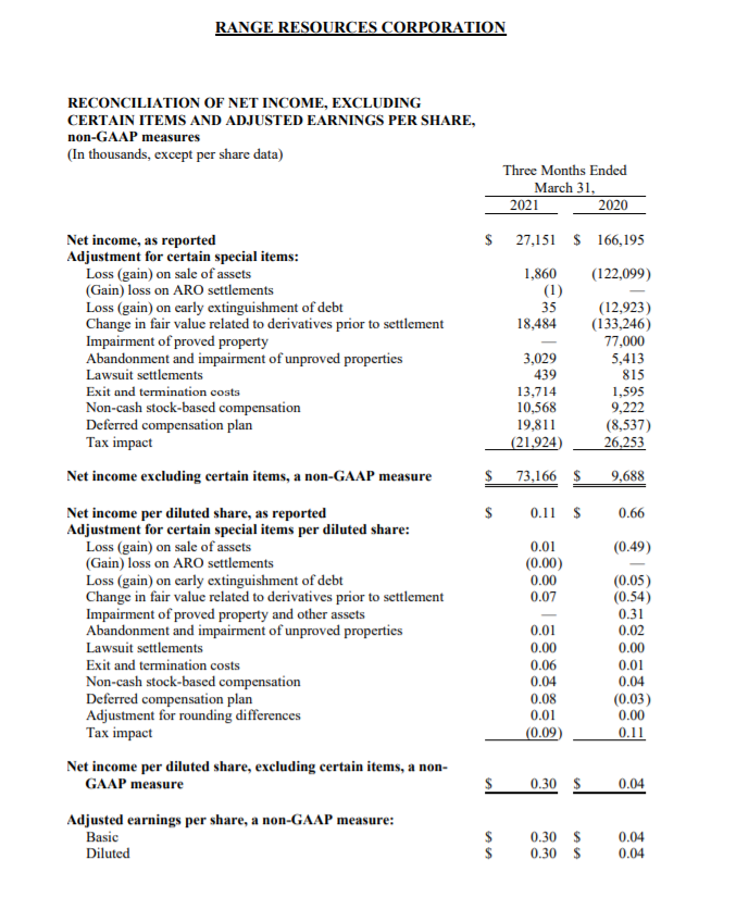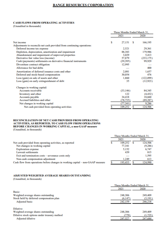 FORT WORTH, Texas, April 26, 2021 (GLOBE NEWSWIRE) — RANGE RESOURCES CORPORATION (NYSE: RRC) today announced its first quarter 2021 financial results.