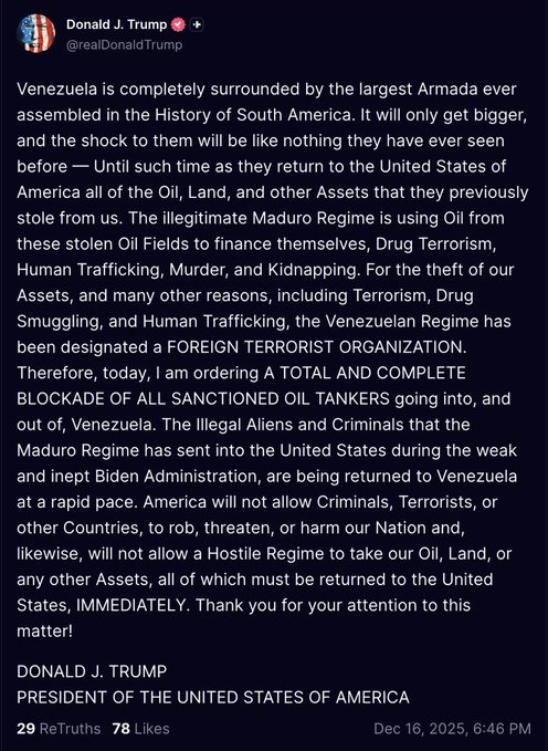 Trump’s statement didn’t mince words. “Therefore, today, I am ordering A TOTAL AND COMPLETE BLOCKADE OF ALL SANCTIONED OIL TANKERS going into, and out of, Venezuela,” he posted.