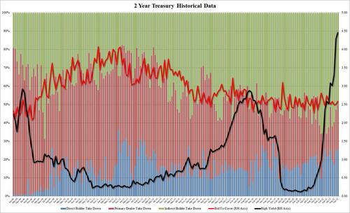 Pricing at 4.460%, the auction stopped at the highest yield since before the global financial crisis, and was also well above last month’s 4.290% amid continued inflation fears and tightening expectations by the Fed. The auction also tailed the When Issued 4.448% by 1.2bps, the third consecutive tail.