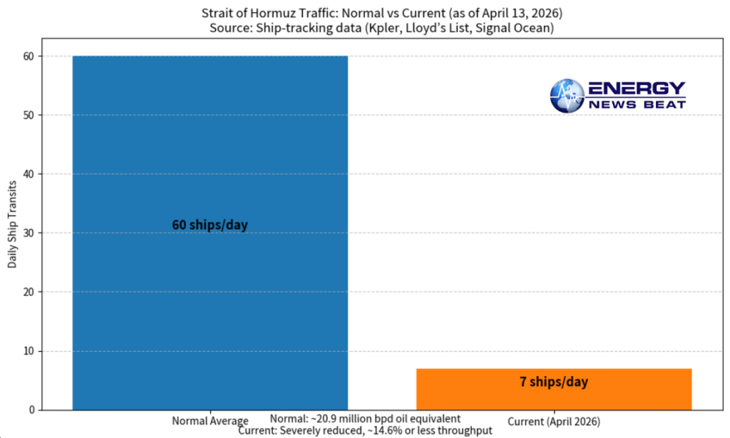 As of April 13, 2026, real-time tracking shows traffic has collapsed:Daily transits (last 24h): ~7 ships (vs. normal ~60) — roughly 7-14% of normal.
