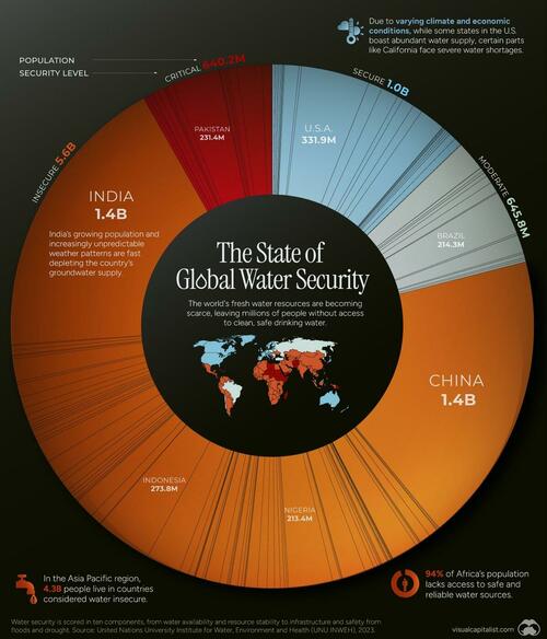 In total, 113 countries are considered water insecure, including the world’s two most populated, India and China. An additional 24 countries are considered critically water insecure, with the largest by population including Pakistan and Ethiopia