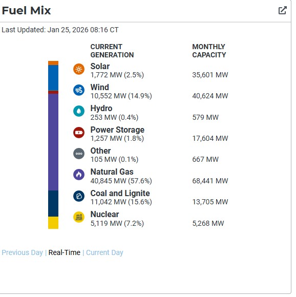 The U.S. power grid isn’t a single entity but a patchwork of regional operators, each with its own mix of energy sources. During storms, reliable baseload sources like natural gas and nuclear often dominate, while renewables like wind and solar can fluctuate due to weather. Storage (e.g., batteries) helps balance intermittency, but its role remains small.Below, we provide breakdowns for key grid operators: ERCOT (Texas), PJM (Mid-Atlantic and Midwest), and ISO-NE (New England). These represent major portions of the U.S. grid. Data reflects real-time snapshots from January 24, 2026, around evening hours when demand peaks. Note: Coal is phasing out in many regions, hydro varies with water levels, and solar output is minimal at night or under cloud cover. Storage is often net-negative during discharge.